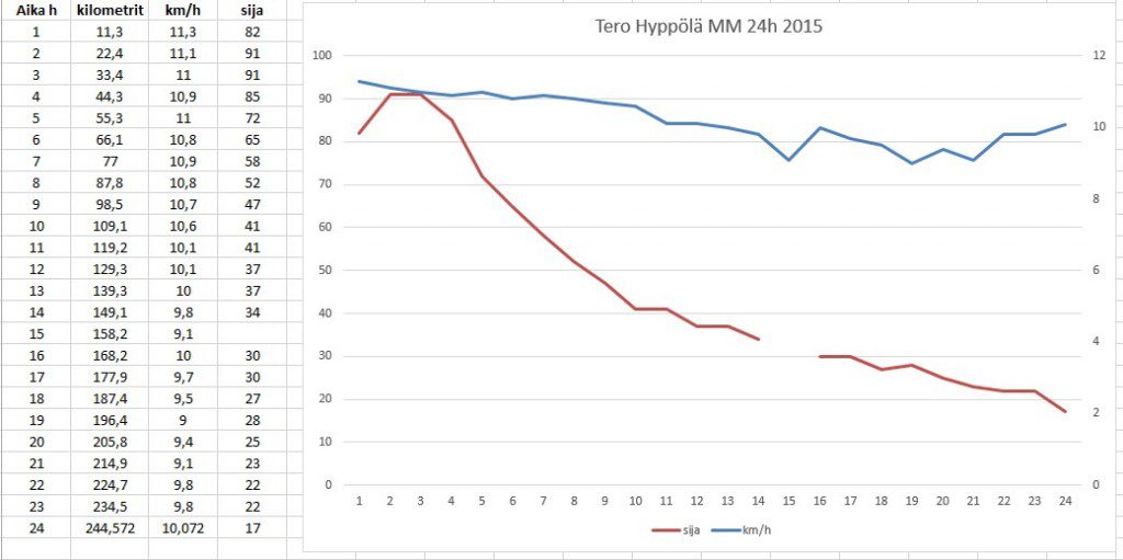 Miesten kilpailun voittotulos 263,89 km on aika ”huono” ottaen huomioon, että mukana oli esim. 285 km juossut Japanin Hara. Voittotulos osoittaa, että reitti oli varsin rankka. Se mikä oli minulle pieni yllätys, oli kärjen tasaisuus ihan voittajasta lähtien. Ajattelin, että kärkipäässä (top 5) on isot eroa ja suma alkaa vasta alle 250 km tuloksilla. Tulosluettelo osoittaa, että taso kärjessä on tiivistynyt. Oma henkilökohtainen tulostavoitteeni oli noin top 15 ja kilometrien suhteen vähintään 240 km, mieluummin 242-245 km. Tulokseni oli 244 572 m ja 17. sija, EM 10. ja toiseksi paras pohjoismaalainen. Kaikin puolin voin olla tyytyväinen saavuttamaani tulokseeni. Ei tällä kunnolla tuon parempaan pysty ja tuo on jo niin hyvä, että sitä en tule enää koskaan parantamaan. Nyt on kolmen parhaan ja kolmen huonoimman 24 h juoksuni keskiarvo 237 620 m ja alkaa kaikki juoksuennätykseni: maraton – 6 h – 100 km – 12 h – 24 h olemaan tekemätön paikka parantaa, joten todennäköisesti minua ei enää näissä karkeloissa nähdä. Oli kuitenkin hienoa olla mukana tuossa kisassa ja tuossa joukkueessa ja kuitata sillä Puolan MM 2012 kisasta vamman takia pois jääminen. Kiitokset koko Suomen joukkueelle, etenkin huoltajalleni Outille.