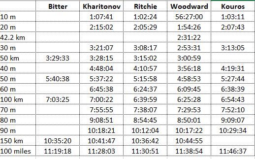 Woodwardin 50-mailiset olivat 4.58.53 + 6.40.01 eli toinen puolisko oli yli puolitoista tuntia ensimmäistä hitaampi. Jokainen joskus liian kovaa aloittanut osannee kuvitella millaisen kiirastulen läpi Woodward taisteli kilpailun jälkipuoliskolla.