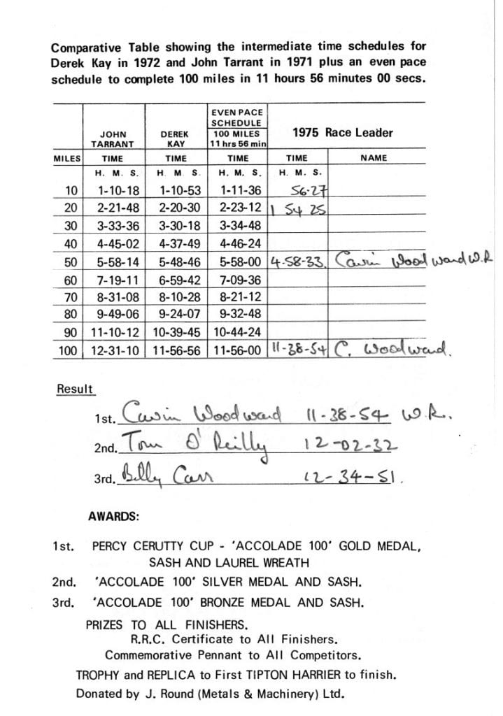 Kuudessa tunnissa Woodward oli juossut 94,54 km ja 100 km täyttyi ME-ajassa 6.25.28. Parannusta entiseen ME-tulokseen tuli massiiviset 34 minuuttia (!!). Sisukkaan britin vauhti hidastui, mutta sata mailai tuli kuitenkin täyteen ME-ajassa 11.38.54, runsaat 18 minuuttia alle Derek Kayn vuonna 1972 juokseman entisen ME-tuloksen.