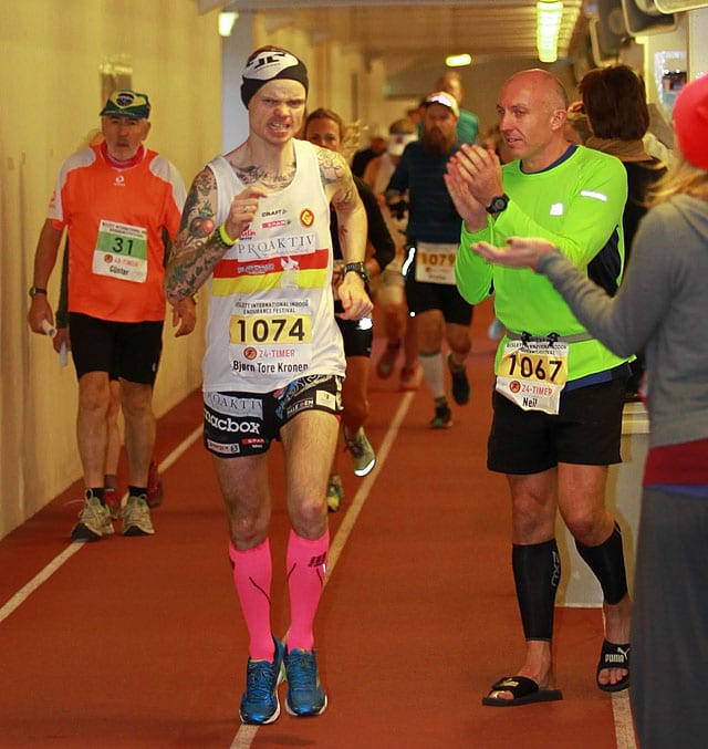 Norjalaisen punk-pop -bändi Goldenboyn rumpalina ja noin 11 000 km vuodessa juoksevana ultrajuoksuammattilaisena tunnettu 36-vuotias Bjørn Tore Kronen Taranger jatkoi Bislettin 24 h sisäratakilpailussa voittoputkeaan Norjan 24 h mestaruuskilpailuissa vakuuttavalla tavalla sinetöiden voittonsa uudella Norjan ennätyksellä 257,606 km.